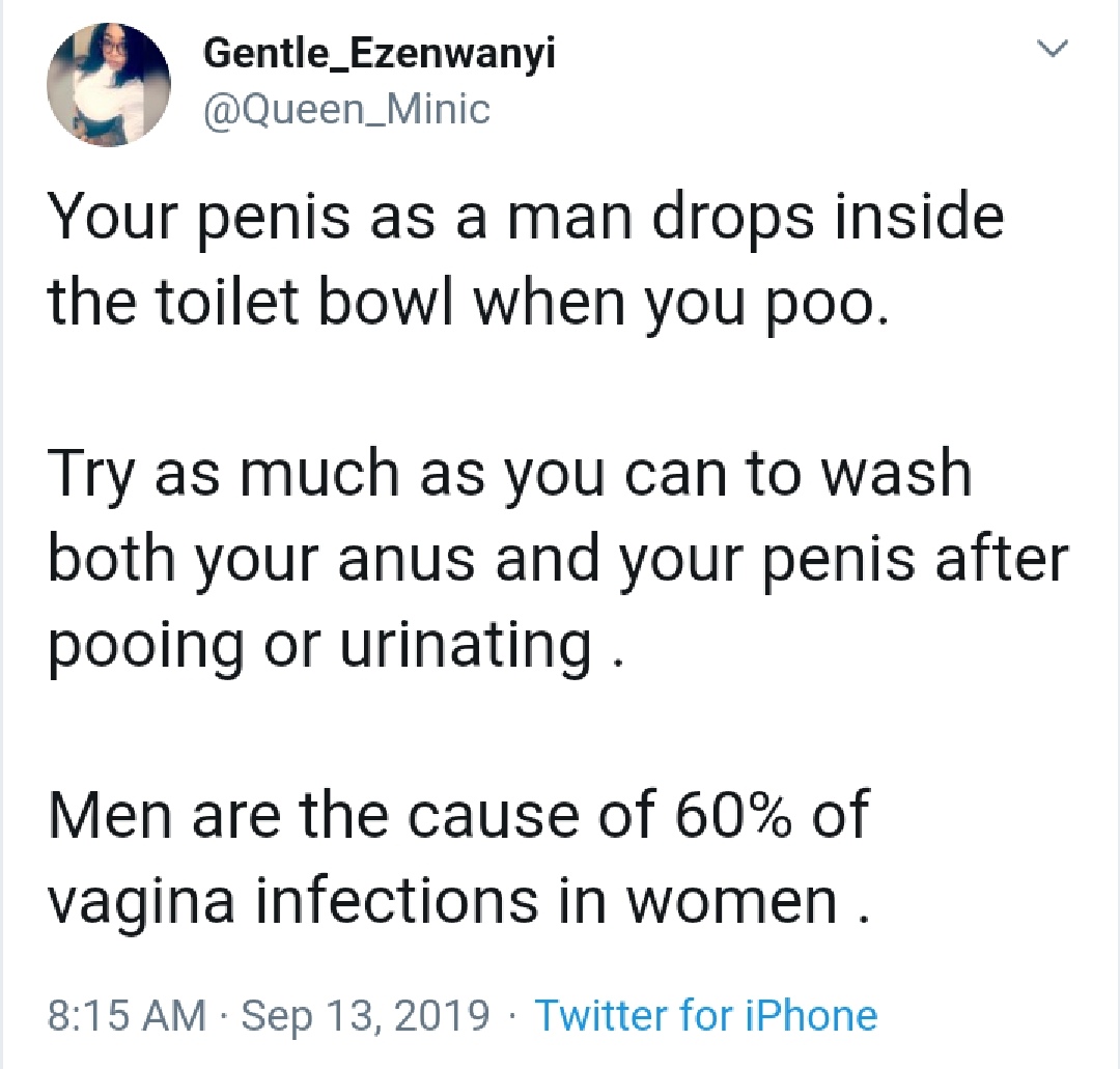 “Your penis as a man drops inside the toilet when you poo. Try as much as you can to wash both your anus and your penis after pooing or urinating. Men are the cause of 60% of vagina infections in women.”, she tweeted.